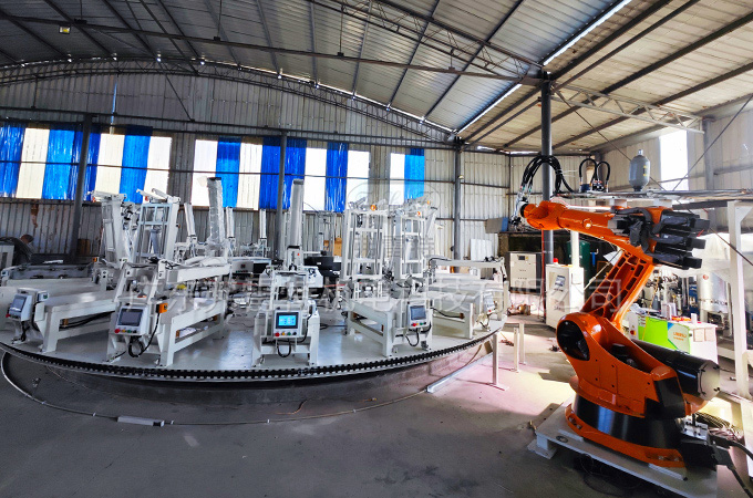 整套聚氨酯發(fā)泡設(shè)備使用了一臺(tái)軟泡聚氨酯高壓發(fā)泡機(jī)(FLT.R-12G),自帶自清潔高壓噴頭,不僅精度高,使用后還無(wú)殘料、免清洗、免維護(hù),黑白料噴嘴,可調(diào)節(jié)壓力平衡,確保黑白料壓無(wú)壓差。加上高精度斜軸式,軸向柱塞變量泵,計(jì)量精確,讓生產(chǎn)更精確。定制了一個(gè)直徑9米的大轉(zhuǎn)盤生產(chǎn)線,搭配20套自動(dòng)化模具模架,自動(dòng)感應(yīng)開(kāi)合澆注,智能化一體操作。還有一個(gè)全自動(dòng)灌注機(jī)器人,全自動(dòng)機(jī)械臂澆注,澆注準(zhǔn)確,發(fā)泡穩(wěn)定,生產(chǎn)效率高,機(jī)械臂能夠完成軌跡澆注的要求,簡(jiǎn)單操作,可以減輕員工的勞力,實(shí)現(xiàn)全面智能化高效生產(chǎn)。