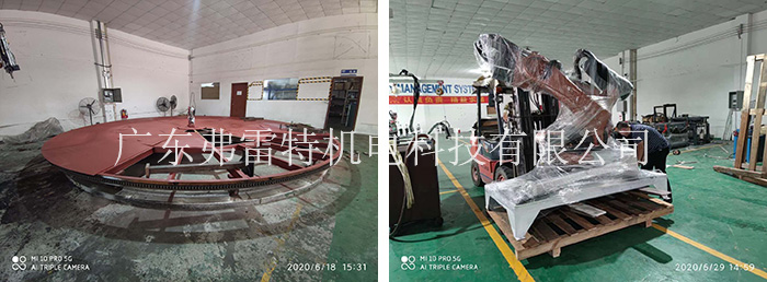 功能:通過7.6米的大型轉盤對12套模架進行固定,360°自動旋轉配合脫模機機器人、注料機器人、聚氨酯發(fā)泡機等設備工作,以達到運動狀態(tài)下進行產品的自動化生產,提高產能。