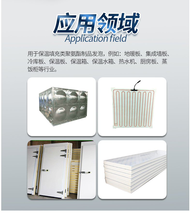 用于保溫填充類(lèi)聚氨酯制品發(fā)泡,例如:地暖板、集成墻板、冷庫(kù)板、保溫板、保溫箱、保溫水箱、熱水器、廚房板、蒸飯柜等行業(yè)。