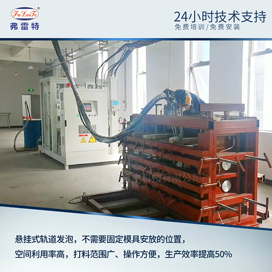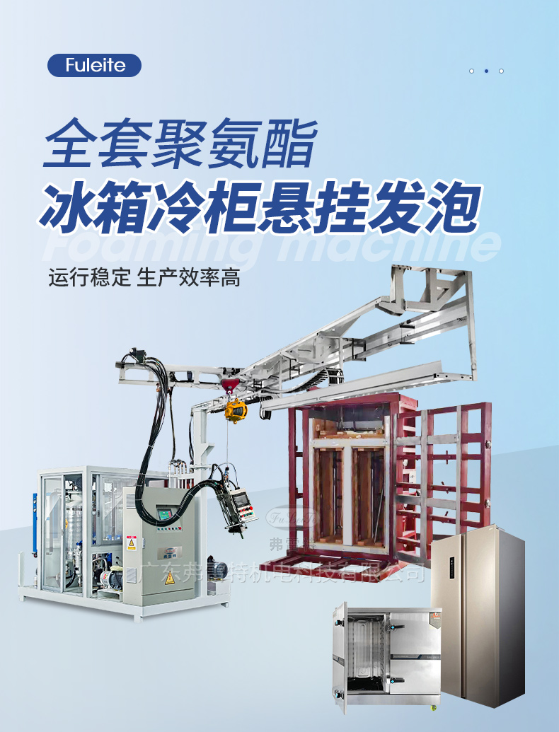 3、懸掛線比傳統(tǒng)擺管式更實用:打料范圍廣、可以選擇不同大小模具操作、定位工位可操控,可以滿足冰箱、消毒柜、保溫箱等大型發(fā)泡產(chǎn)品批量生產(chǎn)。