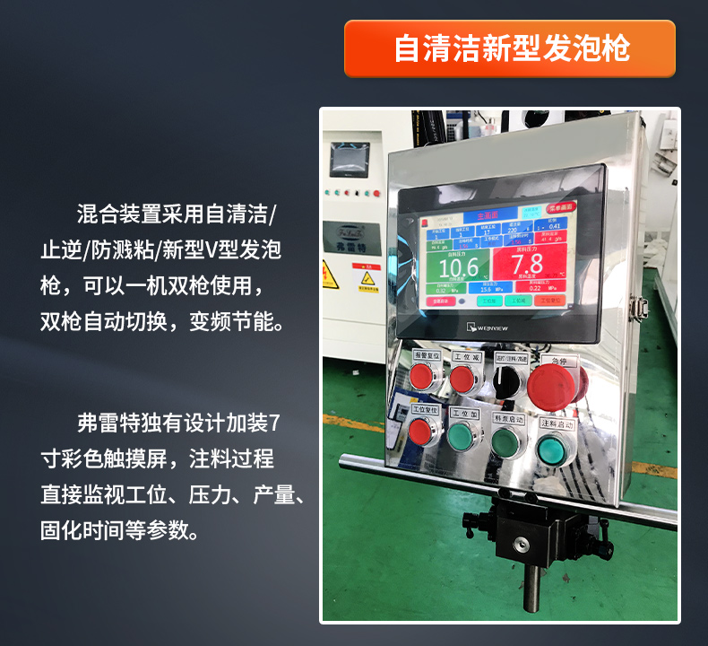 本系統(tǒng)采用自清潔/止逆/防濺粘/新型V型(實現(xiàn)3次混合功能)發(fā)泡槍,結構美觀、操作方便。配合西門子聚氨酯專用泵,注射準,混合效果很好。