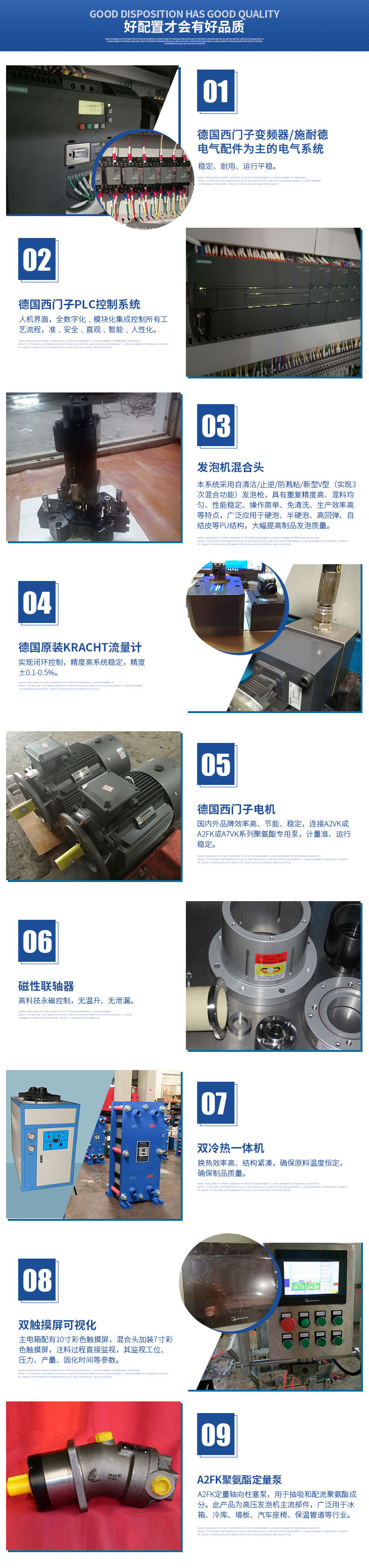 混合裝置:本系統(tǒng)采用自清潔/止逆/防濺粘/新型V型(實現(xiàn)3次混合功能)發(fā)泡槍,結構美觀、操作方便。配合西門子聚氨酯專用泵,注射準,混合效果很好。