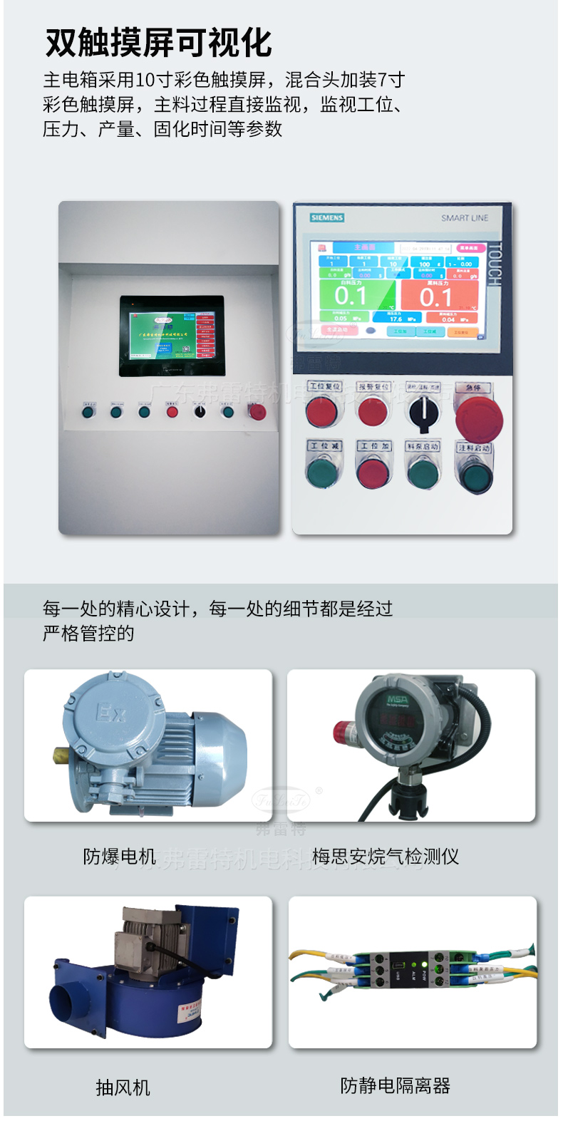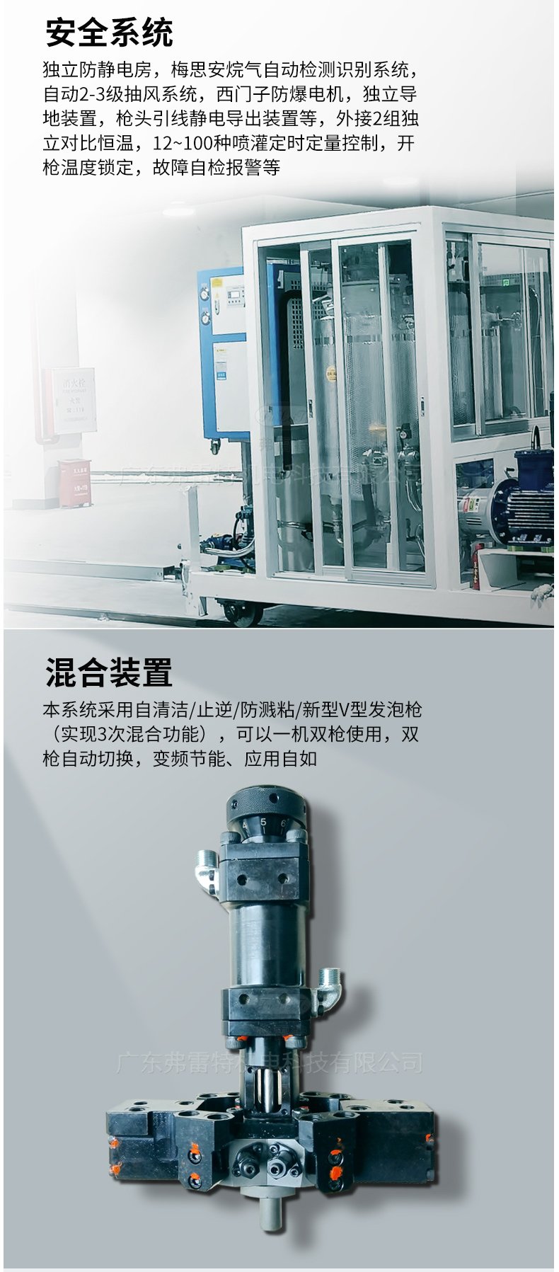 本系統(tǒng)采用自清潔、止逆、防濺粘、新型V型發(fā)泡槍,實現(xiàn)3次混合功能,結構美觀、操作方便。